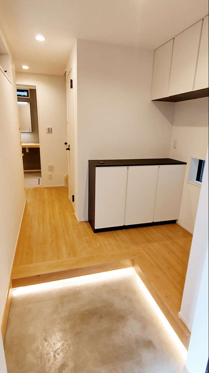 高さに制限がある分、横の広がりで開放感を強調。床面と棚には木材を使用。壁とドアは白、階段やサッシなどの金属は黒で統一しました。