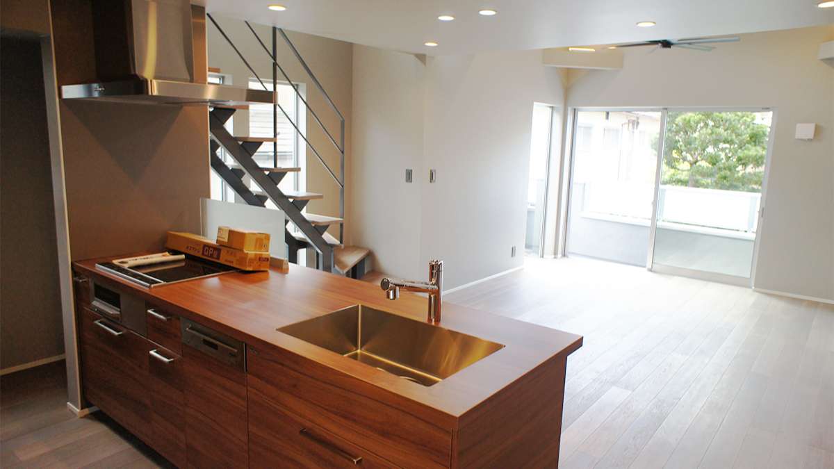 メラミンでラッピングされたキッチンとカップボード(食器棚)はGRAFTEKT(グラフテクト)製で、レンジフードは壁につけるサイドフードタイプ。