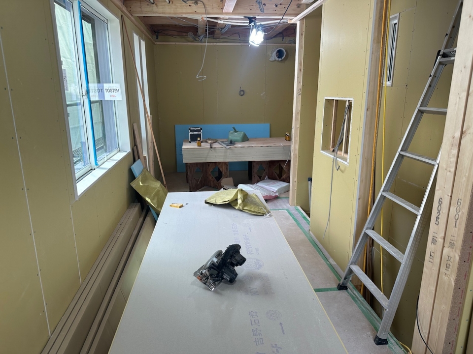外壁サイディング貼り完了。内部ボード貼り施行中。